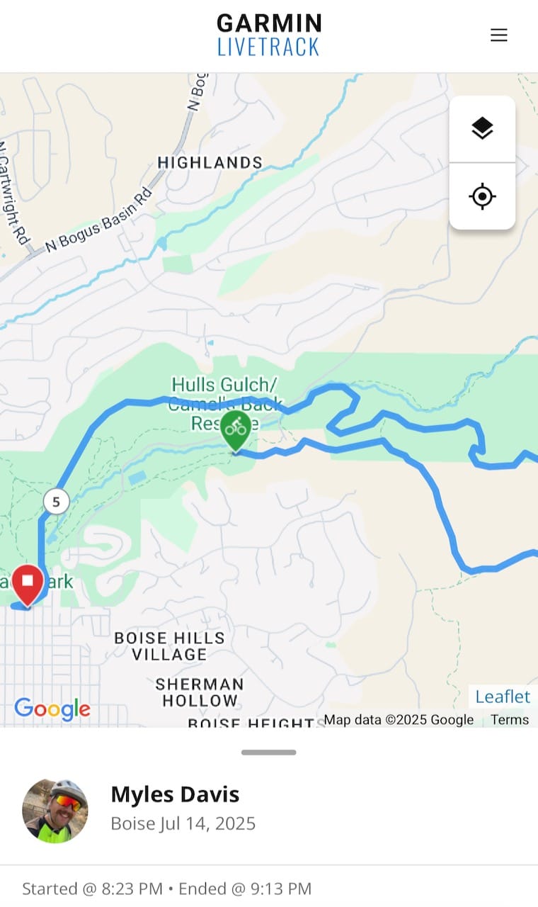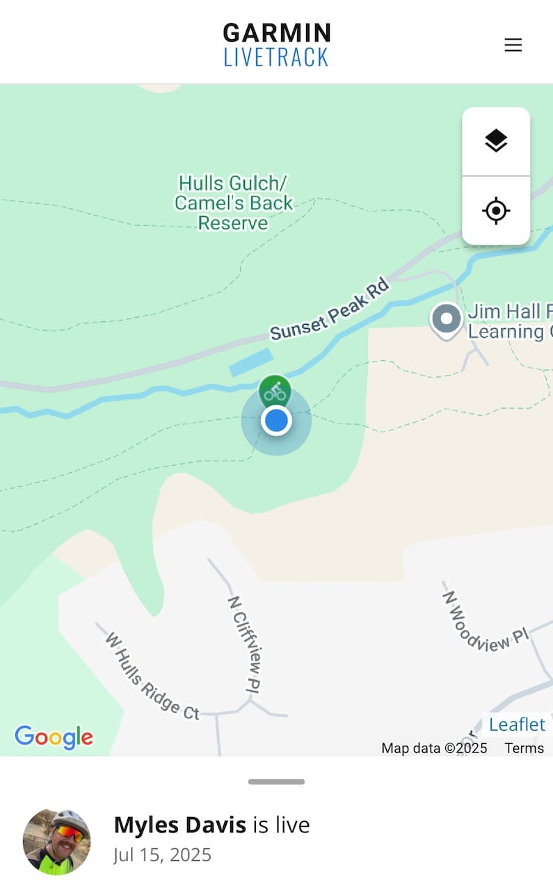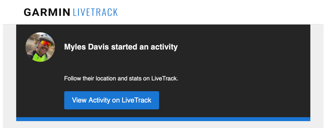 Garmin LiveTrack is my go-to for keeping my partner in the loop. It’s tied to my email and set up to automatically send every time I start an activity on my Garmin watch. No extra steps, no forgetting. That’s especially helpful when I’m starting a ride outside of cell service, since the email goes out automatically as soon as there's a signal. There’s also an option to copy a direct link from the app if I ever want to send it manually via text, but most of the time I don’t need to think about it.