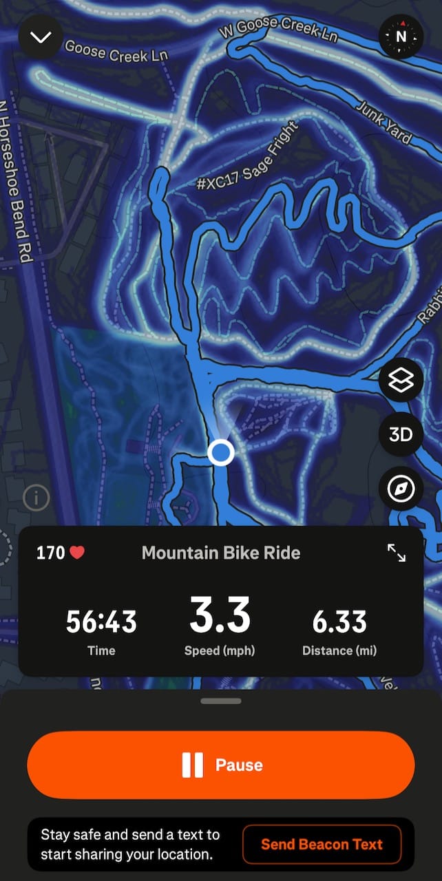 Strava Beacon is my second line of safety. Since I use Strava to track my ride mileage for bike maintenance, I’m already logging everything there. Turning on Beacon is simple with the June 20025 Strava update. It is now at the bottom of your record ride screen. I send that link when I start my ride to a riding buddy who knows my habits and the terrain, just in case something goes sideways and I need help from someone who understands the area.